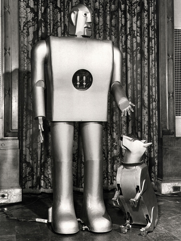 Elektro is a robot built for the 1938 World's Faire by J.M. Barnett, Jack Weeks Sr., Harold Gorsuch, and other engineers at the Westinghouse Electric Corporation. He can walk, talk, smoke a cigarette, everything that being a human requires! He's a really cool example of early robotics and what humans imagined the robots of the future to look like. In 1940 he got a dog!