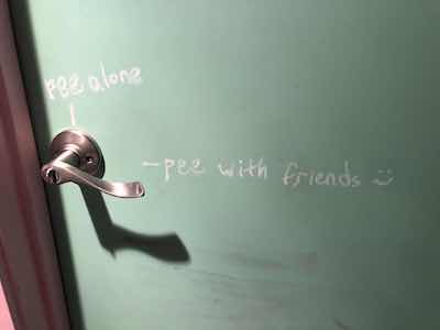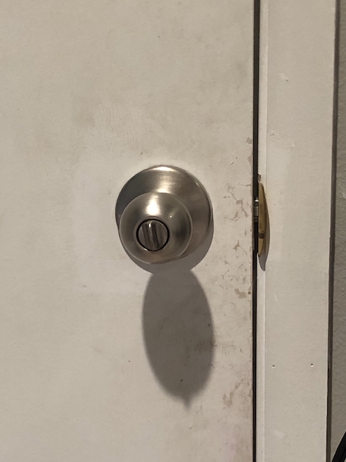 Coffee shop. This is the one that inspired this list because damn this is atrocious. The handle is locked from the outside, you get a phyiscal key from the front. But it's always unlocked from the inside, so there is no way to confirm the lock. Additionally, anyone with a second key could get in no problem. I pee as fast as possible in this one.