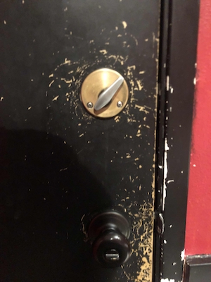 Local bar. No photo because of the graffiti/stickers, you will have to use your imagination. This is one of those push-in locks on the handle which unlocks as soon as you turn the handle. Very tough to see from afar, and no way to double check the lock.
